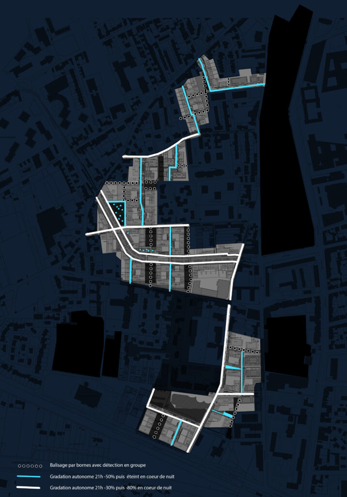 de 21h de -50 % puis éteint en cœur de nuit (en bleu), et -30 % puis -80 % en cœur de nuit (en blanc).